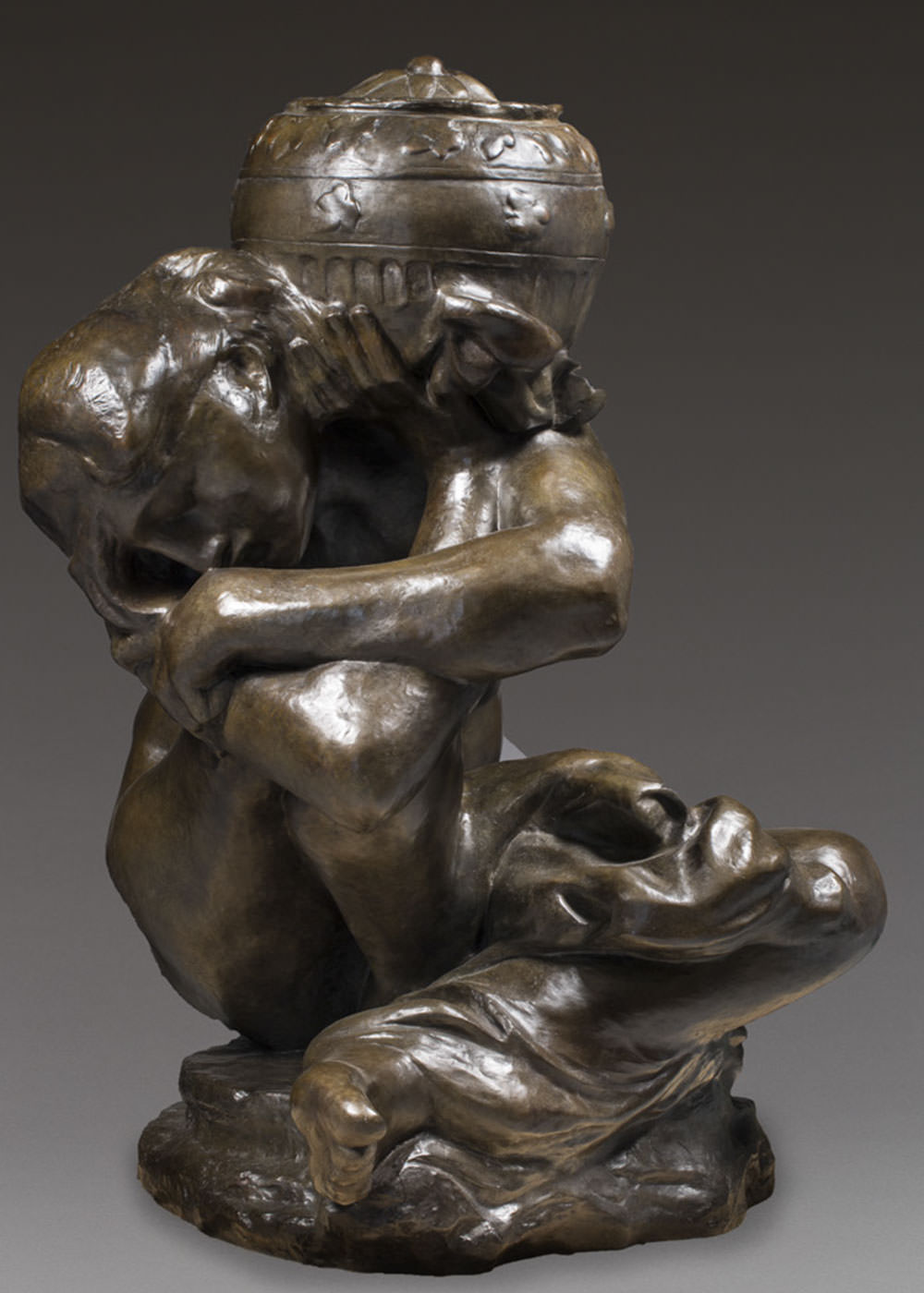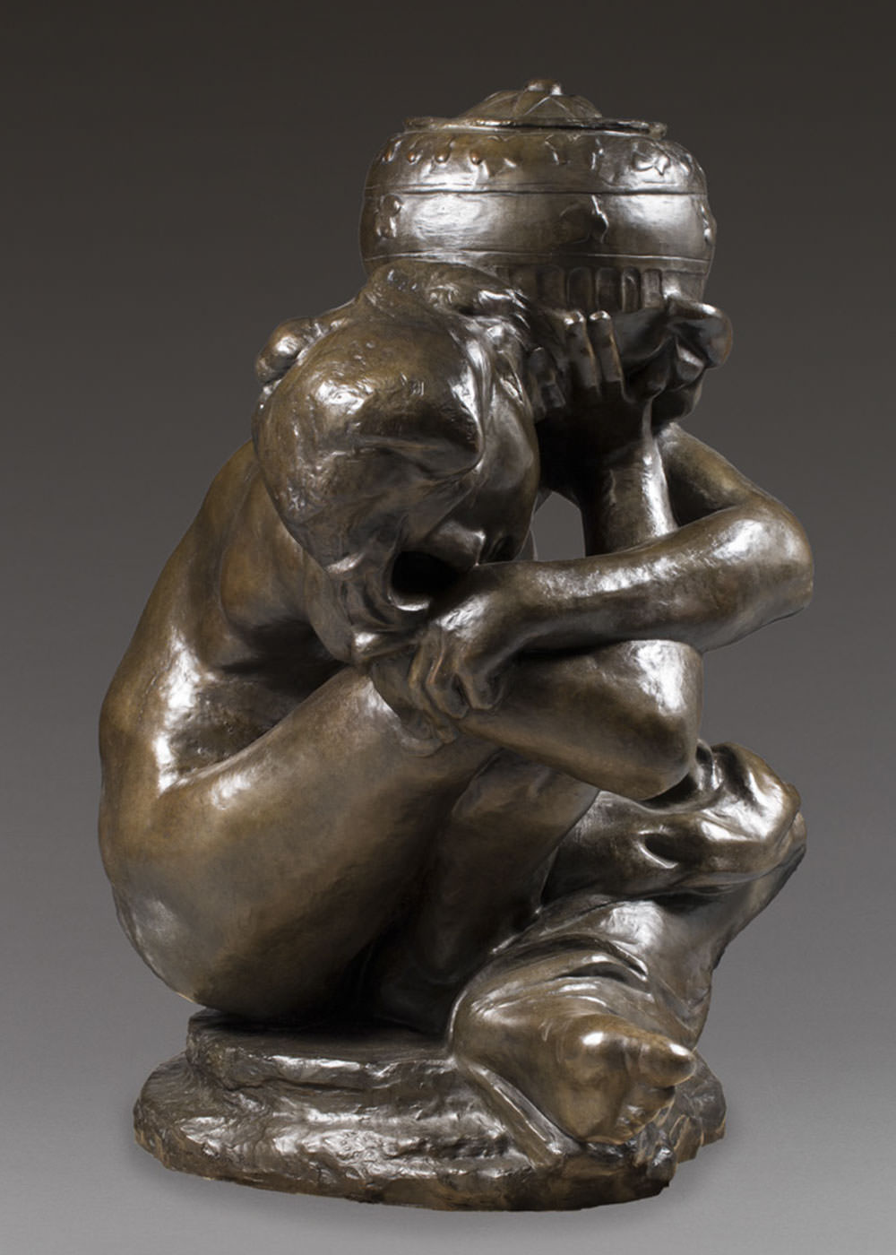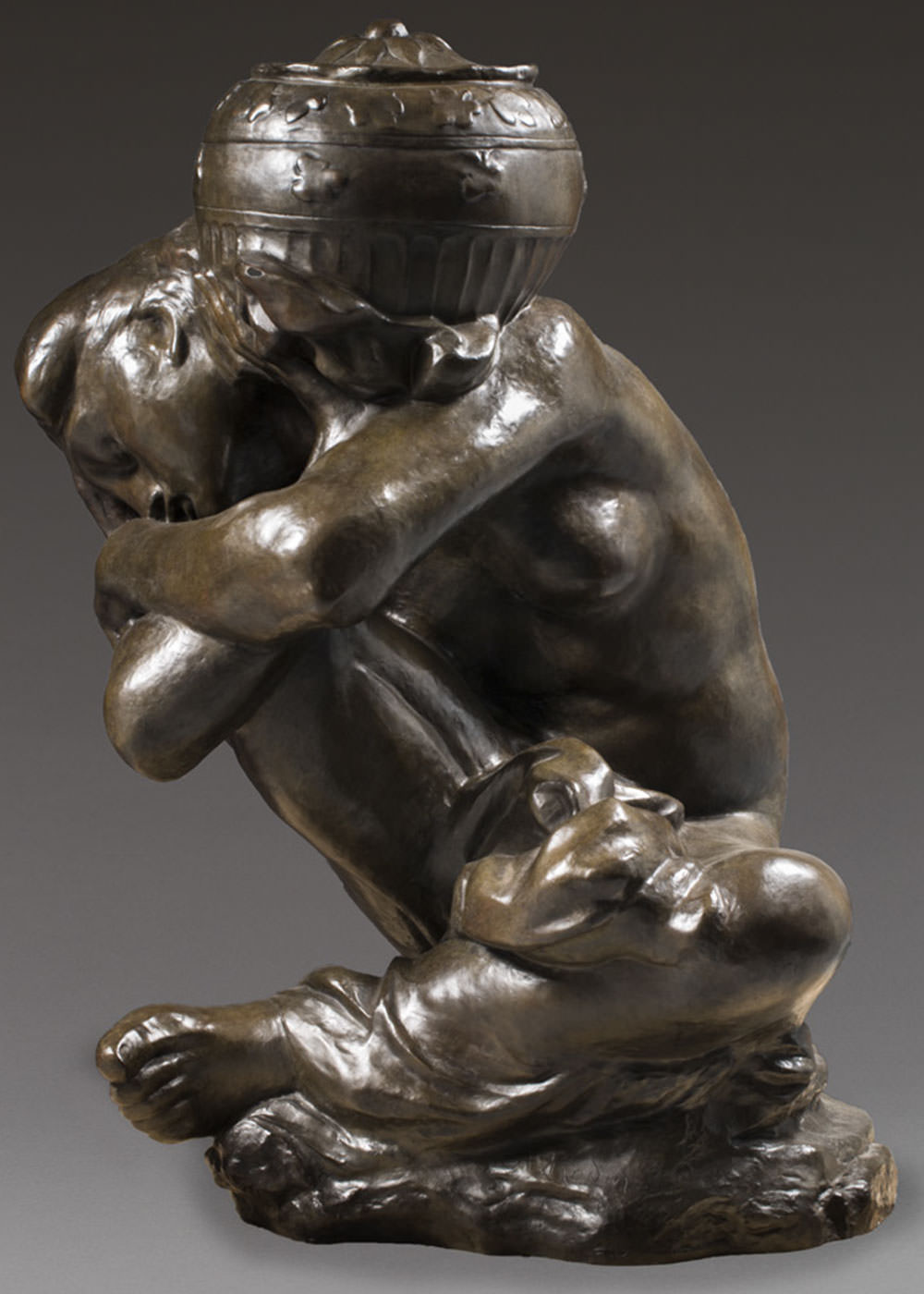 それにもかかわらず1900年に円形台へと置き換えられたコリント式柱頭の頂上に置かれた時は石膏像だった。その後、ロダンは「うずくまる女」を大きくし、1909年のサロンドートンヌで展示した。壺をもつカリアティードと同様に、本物の石のカリアティードと同じやり方を試そうとさせた、この「偽」カリアティード(なぜならプレス向けの像のタイトルだったのだ)との出会いがおそらく良い結果をもたらしたのだ。アンリ・ルボッセが1911年以前に、この像の巨大化に着手している。